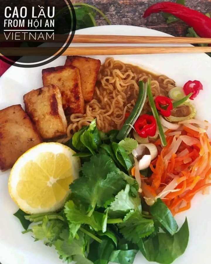 Cao lầu is a regional dish, from the city of Hội An, in central Vietnam’s Quảng Nam Province. It typically consists of pork and greens on a bed of rice noodles in a slightly spicier broth & topped with oodles of fresh herbs & shoots.
