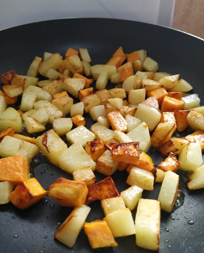 3) Peel & cube two potatoes. I used one white & half a large Sweet Potato. I then shallow-fried them, until golden & crispy.