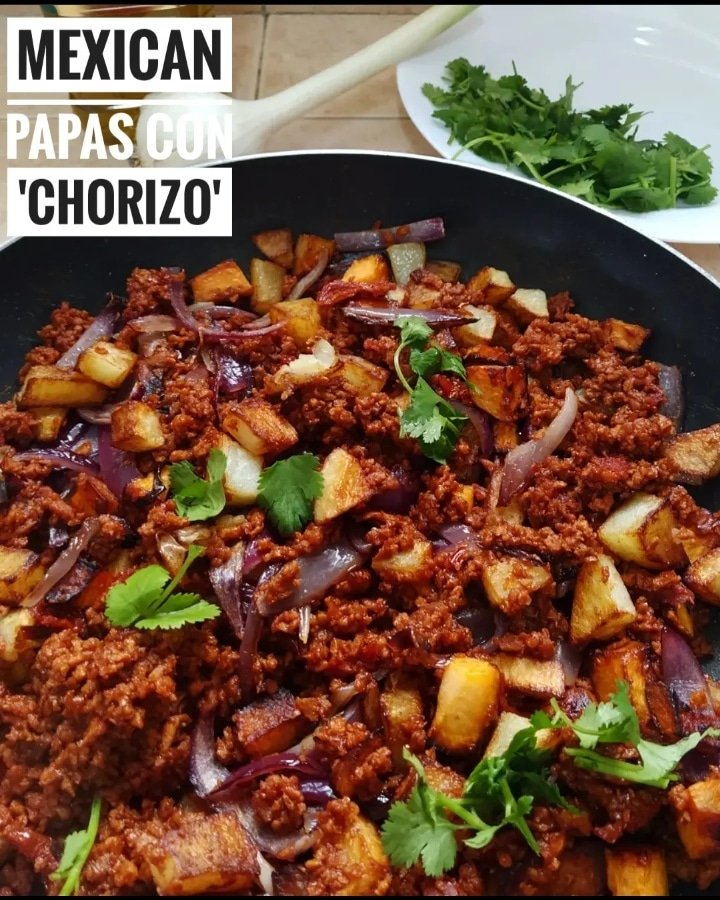 As a vegan, THIS meal is a completely cruelty free version of a popular Mexican dish retaining all the flavour but made with Soyrizo (and sauted Potatoes & Onions).