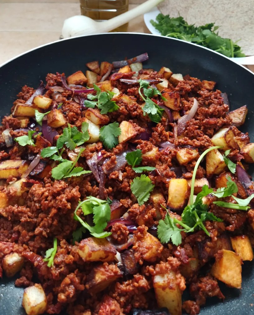 As a vegan, THIS meal is a completely cruelty free version of a popular Mexican dish retaining all the flavour but made with Soyrizo (and sauted Potatoes & Onions).
