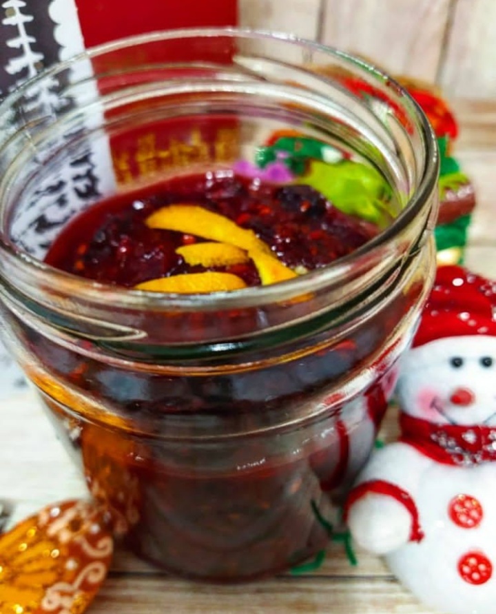 3) Add all ingredients to a pan & heat gentle until the mixture has thickened nicely & the cranberries look plumper