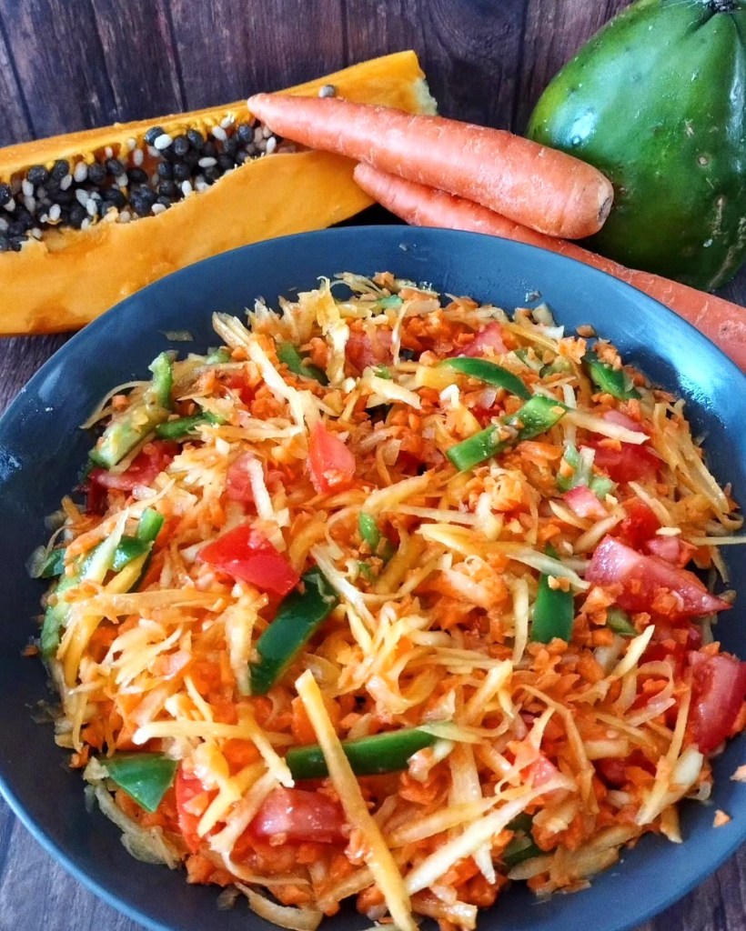 On our trips to Asia, one of our favourite sides, is Thai Green Papaya Salad.