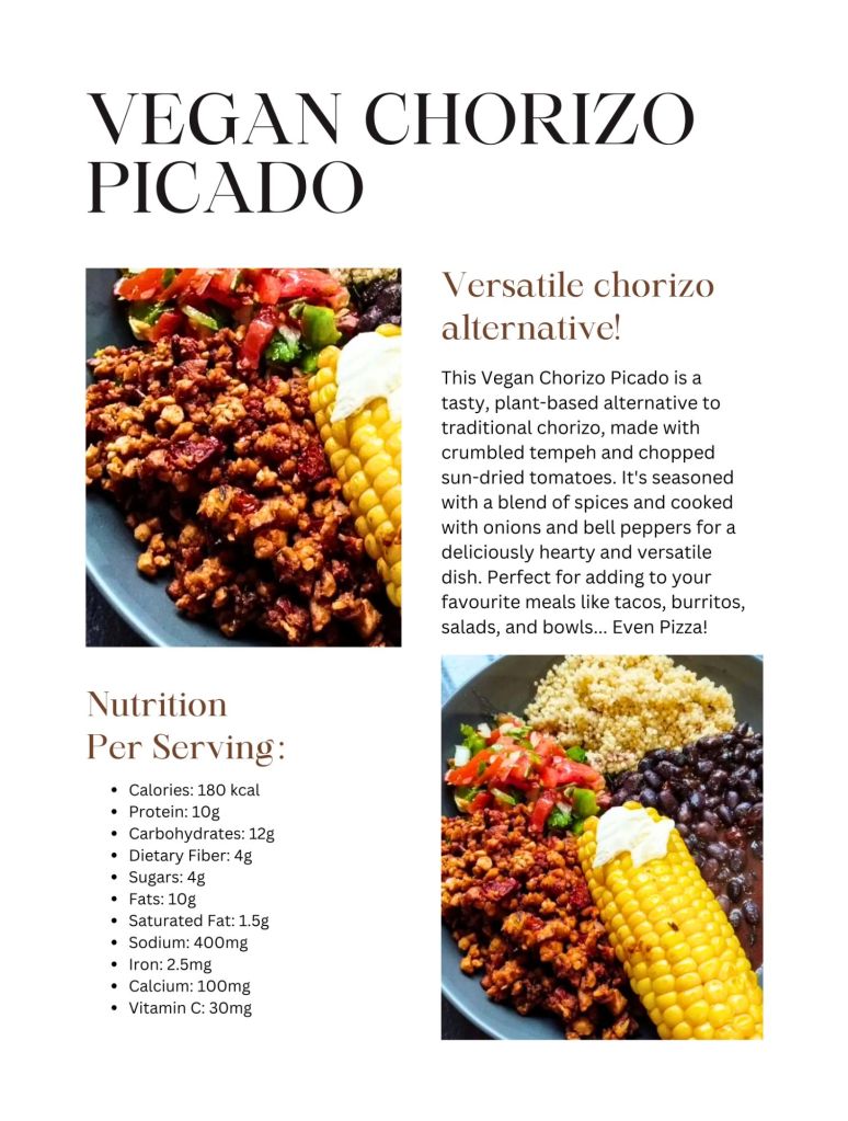 This Vegan Chorizo Picado is a flavourful, plant-based alternative to traditional chorizo, made with crumbled tempeh and chopped sun-dried tomatoes. It’s seasoned with a blend of spices and cooked with onions and bell peppers for a deliciously hearty and versatile dish. Perfect for adding to your favourite meals like tacos, burritos, salads, and bowls.
