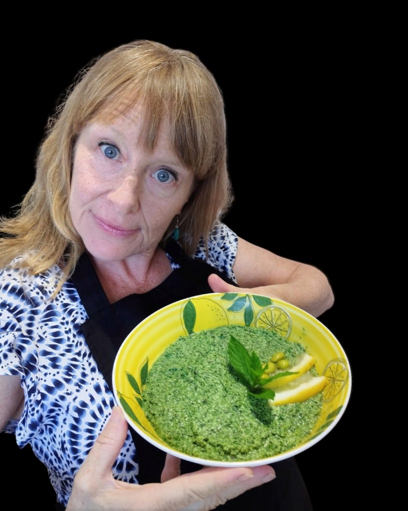 I had a bag of edamame, homegrown chard, spirulina, mint and lemon to use up, so I blended them into a bright protein-packed dip!